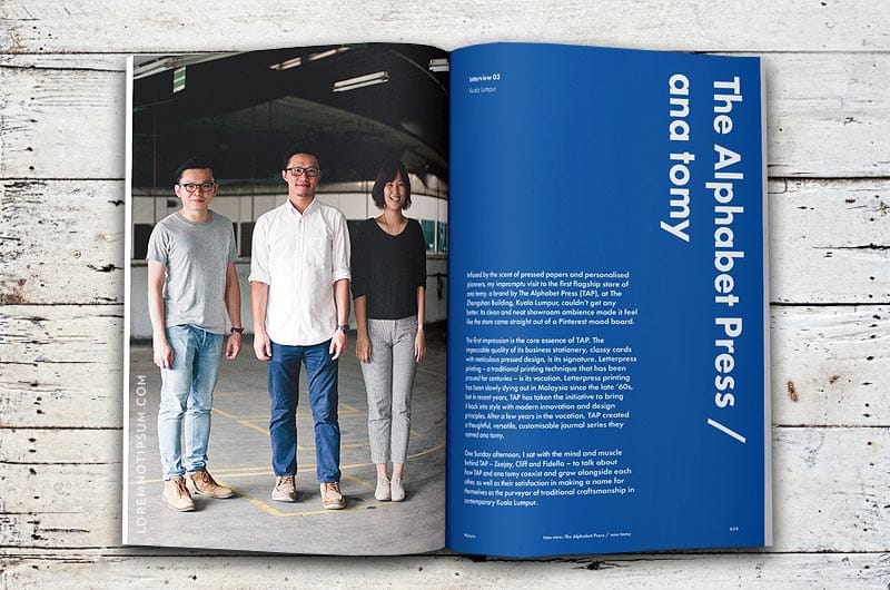 In Pangkor Island, Malaysia, we learnt of Munir Shaari’s nation-wide journey of rediscovering his Malay roots through Misi Mencari Melayu. On the country’s East Coast, in Kuala Terengganu, we visited the Nysakapas backyard studio, where former city girl Nisa developed handmade batik terap with modern, progressive motifs. Back in our home base, Kuala Lumpur, Zeejay, Cliff and Fidella of The Alphabet Press related their success story which led to the birth of ana tomy. From the sleepy town of Behrang in Perak across the South China Sea to Sabah on the Borneo Island, our contributors offer personal anecdotes, travel experiences and unique perspectives of the country they call home.