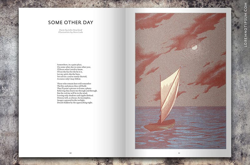 Popshot Magazine Issue (the Adventure Issue) 15 is available now on loremnotipsum.com. Spread across its pages, expect to find an alluring collection of illustrated poems and short stories that take us to the moon, the end of the world, a deserted cluster of islands, a lake in Mexico, a turbulent hot air balloon ride and an infant’s first encounter with language.